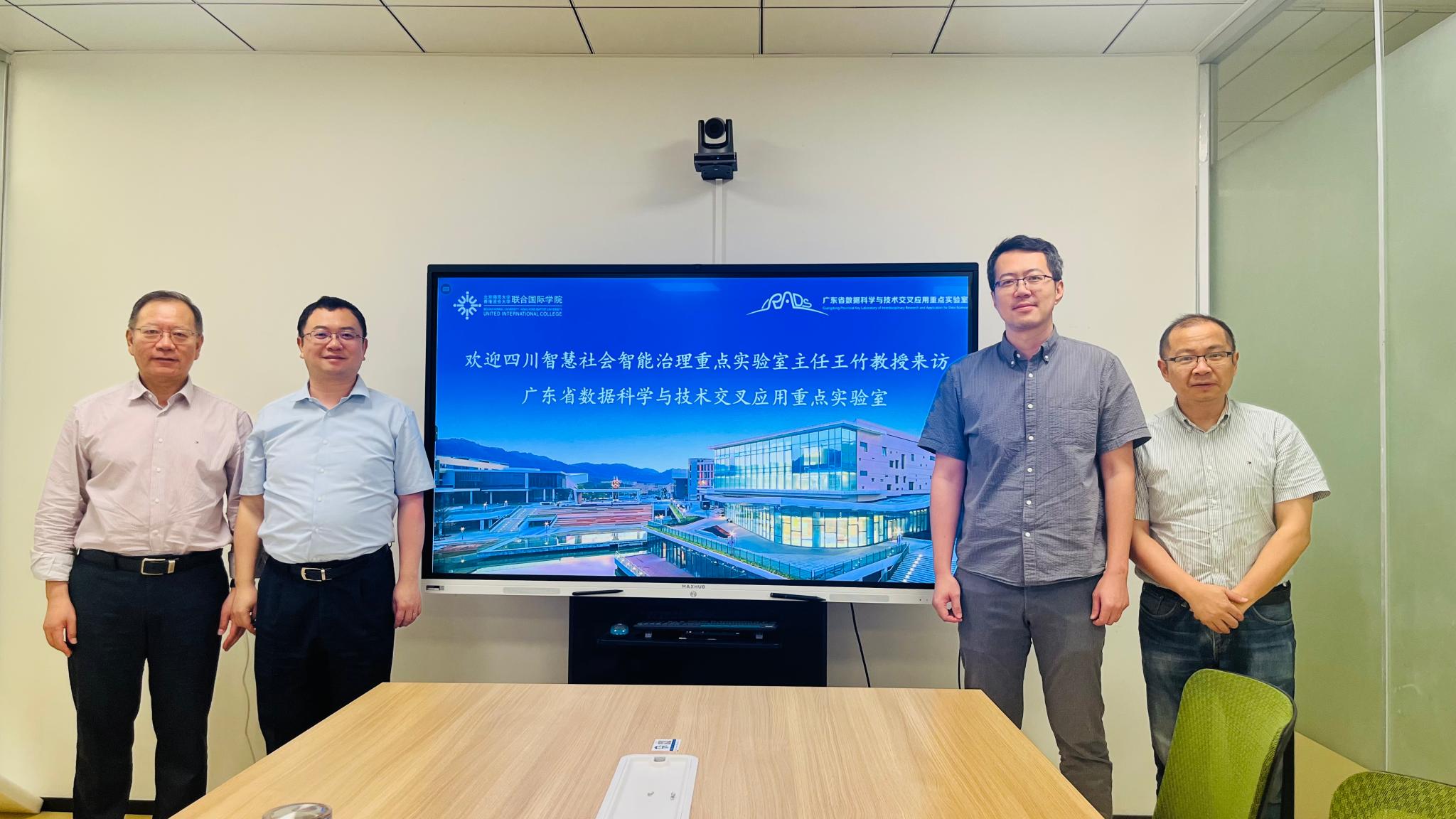 2024年4月28日,四川智慧社会智能治理重点实验室主任王竹教授来访北师港浸大广东省数据科学与技术交叉应用重点实验室(下文简称:重点实验室)并进行了深入交流。