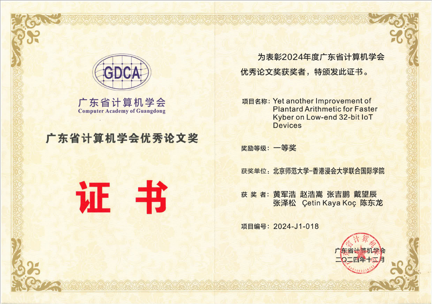 2024年12月14日至15日,广东省计算机学会在广东省东莞市举办 “广东省计算机学会40周年庆典活动——2024年广东省计算机学会学术年会暨粤港澳大湾区数字人的生产与驱动技术高端论坛”。会上,广东省计算机学会对2024年学会优秀论文进行了表彰奖励,UIC广东省数据科学与技术交叉应用重点实验室成员、理工科技学院统计与数据科学系陈东龙副教授与其指导的博士生黄军浩、硕士生赵浩嵩等发表的论文荣获一等奖。